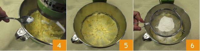 À ce stade, ajoutez le sel 4, travaillez encore quelques minutes et arrêtez le batteur un instant 5. Tamisez la farine directement dans le bol,