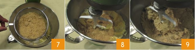 et ajoutez également la farine de noisettes, en la tamisant elle aussi 7. Remettez l'appareil en marche 8 et laissez les farines s'incorporer complètement 9.