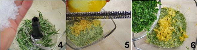 Hachez les herbes aromatiques avec une poignée de gros sel 4, râpez le zeste de la moitié d'un citron dans le hachis 5 et enfin ajoutez le persil finement haché 6.