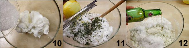 Incorporez délicatement aux blancs le sel fin et gros 10, le hachis d'herbes aromatiques restant et râpez le zeste de l'autre moitié du citron 11, puis ajoutez et mélangez le tout en ajoutant autant de bière 12 que nécessaire pour obtenir une consistance dense et crémeuse.