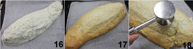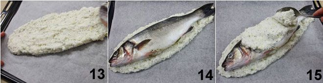 Étalez une feuille de papier cuisson sur une plaque (ou un plat) puis déposez une fine couche (environ 1,5 cm) du mélange obtenu, qui formera le lit de cuisson pour le bar 13. Placez ensuite le bar sur le lit de sel 14 et recouvrez-le avec le mélange de sel en le pressant délicatement pour bien faire adhérer la pâte 15.