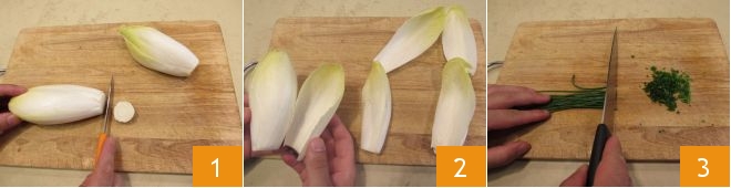 Pour préparer les barquettes d'endive aux fromages, commencez par nettoyer les légumes. Rincez les légumes et séchez-les bien avec un torchon propre. Ensuite, éliminez la partie du trognon de l'endive 1. Défeuillez-la délicatement pour obtenir 12 feuilles 2 en faisant attention à ne pas les casser. Mettez-les de côté. Continuez en hachant finement la ciboulette 3.
