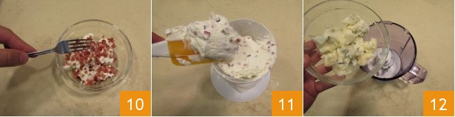 Dans l'autre petit bol avec la robiola, ajoutez le speck 10, en veillant à garder quelques dés de speck de côté pour décorer à la fin. Mélangez avec la robiola et transférez-le dans une deuxième poche à douille munie d'une douille étoile 11 que vous mettrez de côté. Procédez à la préparation de la troisième crème : dans un mixeur, mixez le gorgonzola 12.
