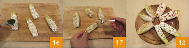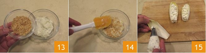 Lorsque vous aurez obtenu une crème homogène, transférez-la dans un petit bol et ajoutez-y les cerneaux de noix hachés 13. Gardez un peu de noix de côté pour la décoration finale. Mélangez les ingrédients avec une spatule 14 et transférez également cette crème dans une poche à douille avec une douille étoile. À ce point, les crèmes sont prêtes et vous pouvez procéder au remplissage des feuilles d'endive. Prenez une feuille d'endive et la première poche à douille avec la crème de fromage de chèvre et ciboulette. Remplissez le creux de la feuille 15.