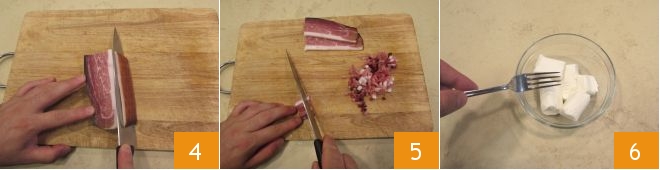 Puis, coupez la couenne du speck 4, ensuite en fines lanières et obtenez-en des petits dés 5. Préparez ensuite les différentes garnitures avec les fromages : versez la robiola et le fromage de chèvre et émiettez les fromages avec une fourchette 6.