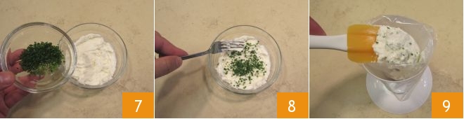 Dans le petit bol avec le fromage de chèvre, ajoutez la ciboulette (réservez quelques cuillères à café pour la décoration finale) 7 et mélangez avec une fourchette 8. Transférez ensuite la crème dans une poche à douille avec une douille étoile 9 et mettez-la de côté.