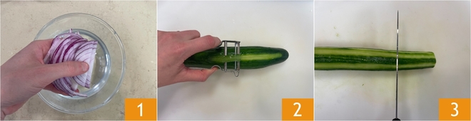 Pour préparer les barquettes de concombre, nettoyez et émincez l'oignon rouge en julienne, puis faites-le tremper dans de l'eau froide pendant 10 minutes 1. Avec un épluche-légumes, pelez les concombres en bandes alternées 2, puis coupez-les en tronçons d'environ 10 cm de long 3.