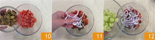 Ajoutez les olives taggiasche 10, les oignons égouttés 11 et la chair des concombres 12.