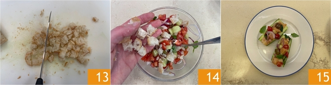 Coupez le pain rassis en dés d'environ 1 cm 13 et versez-les dans le bol avec le reste des ingrédients 14. Assaisonnez avec du vinaigre, parfumez avec du basilic frais et mélangez, puis laissez reposer au moins 10 minutes afin que les saveurs se développent bien. Garnissez les coques de concombre avec la panzanella et terminez par un filet d'huile. Vos barquettes de concombre sont prêtes à être servies 15.