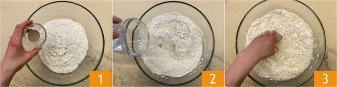 Pour préparer le battilocchio napolitain, versez la farine et la levure dans un grand bol 1, puis mélangez avec la main. Ajoutez une partie de l'eau 2 et mélangez encore pour l'absorber complètement 3. Versez l'eau restante petit à petit en continuant à pétrir avec la main jusqu'à obtenir un mélange homogène.