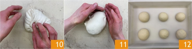 Prenez une portion de pâte à la fois et tirez les bords de l'extérieur vers l'intérieur 10, puis roulez-la sur le plan de travail pour former des petites boules 11 et placez-les au fur et à mesure dans une boîte de fermentation 12. Fermez avec le couvercle et laissez lever pendant environ 6 à 8 heures à une température d'environ 18°-24°.