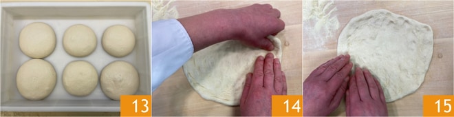 Après le temps de levée, les pâtons auront doublé de volume 13. Étalez le premier pâton en l'élargissant délicatement avec les mains 14, puis aplatissez la pâte avec vos doigts pour former un disque d'environ 18 cm de diamètre, en veillant à ne pas trop affiner le centre 15.