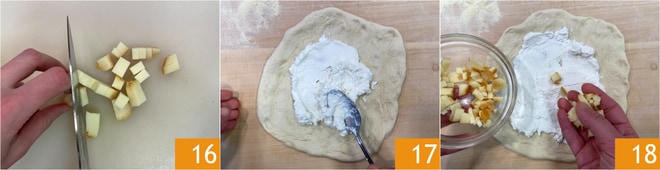 Procédez de cette manière pour étaler tous les pâtons, puis passez à la garniture : coupez la provola en dés 16, puis détendez la ricotta avec un peu de lait et étalez-la sur la surface, en laissant les bords libres 17. Répartissez les dés de provola 18.