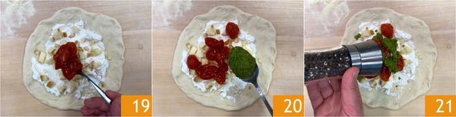 Ajoutez la sauce de tomates 19 et le pesto 20. Enfin, assaisonnez avec un tour de moulin à poivre 21.