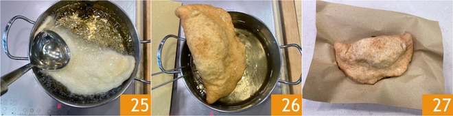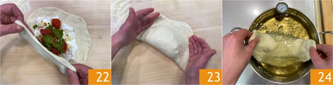 Ployez la pâte en deux 22 pour former un croissant, puis appuyez bien autour de la garniture pour éliminer toute l'air 23. Quand vous avez farci tous les calzones, vous êtes prêts à frire : dans une grande casserole, chauffez l'huile de graines à 180°, puis immergez délicatement le calzone 24.