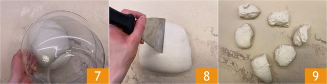 Lorsque la pâte est lisse, homogène et compacte, formez une boule, couvrez avec le bol 7 et laissez reposer à température ambiante pendant 5 minutes. Une fois ce temps écoulé, effectuez quelques plis supplémentaires, puis recouvrez à nouveau la pâte avec le bol et laissez reposer pendant 30 minutes supplémentaires. Après le temps de repos, divisez la pâte avec un coupe-pâte 8 en 6 portions d'environ 280 g chacune 9.