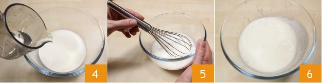 Passez à la préparation de la garniture, dans un bol mettez la crème bien froide, le lait froid et le sirop de sucre 4 puis avec le fouet, mélangez les ingrédients 5 pour obtenir un mélange aéré et crémeux mais non monté 6 que vous conserverez au réfrigérateur.