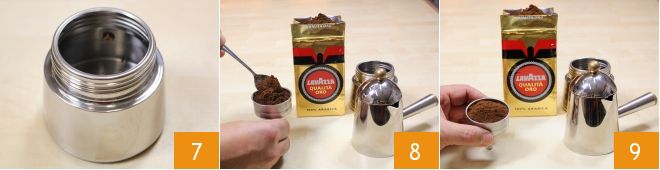 Préparez le café avec la cafetière : pour obtenir un excellent café, remplissez la chaudière de votre cafetière avec de l’eau froide et de préférence faible en calcaire, en faisant attention à ne pas dépasser la soupape de sécurité 7 (sinon vous obtiendrez un café plus long). Remplissez le filtre avec le café moulu, formant un petit monticule que vous égaliserez en tapant le filtre sur la table avec des mouvements décidés (8-9). Ne pressez pas avec la cuillère, ni ne faites de trous sur la surface.