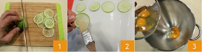 Pour préparer le bavarois à la noix de coco et au citron vert, commencez par la décoration qui nécessite un peu de temps (vous pouvez aussi la préparer la veille) : lavez et tranchez le citron vert en tranches de 2 mm d'épaisseur 1, puis saupoudrez-les de sucre glace 2 et faites-les sécher au four à environ 70° pendant 6 heures (vous pouvez profiter de la basse température du four pour réaliser des meringues à offrir avec le bavarois !). Passez à la préparation du biscuit : dans un robot culinaire, commencez à travailler les œufs 3 avec les fouets (vous pouvez aussi utiliser un batteur électrique)