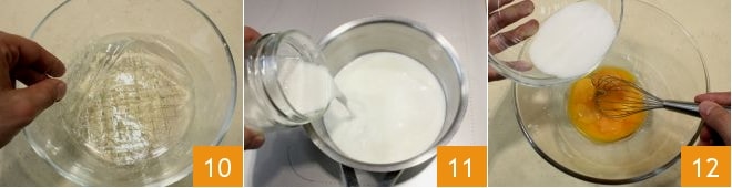 Entre-temps, occupez-vous du bavarois : mettez la gélatine à tremper dans de l'eau froide pendant au moins 10 minutes 10. Dans une casserole, versez le lait et la purée de coco 11 et portez à ébullition. Travaillez les jaunes d'œufs avec le sucre avec un fouet 12.