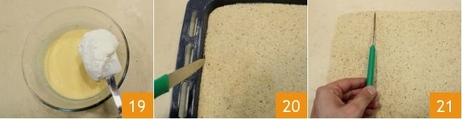 incorporez-la en trois fois à la crème lorsqu'elle sera complètement froide 19, en mélangeant de haut en bas pour ne pas la démonter. Sortez le biscuit du four, détachez les bords délicatement de la plaque de cuisson en vous aidant avec la lame d'un petit couteau 20, puis divisez-le en rectangles d'environ 20 cm de côté (ils doivent être légèrement plus petits que le moule à cake) 21 ;