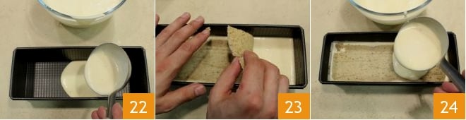 prenez un moule à cake de 22x9 cm et versez-y le bavarois en vous aidant d'une louche 22 jusqu'à un peu moins de la moitié du moule. Posez délicatement sur le bavarois un rectangle de biscuit, en le déroulant doucement 23 ; terminez de verser le bavarois 24