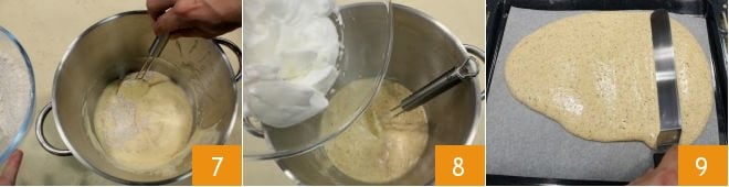 puis incorporez petit à petit les poudres aux œufs 7 et mélangez avec une spatule, ajoutez également les blancs d'œufs montés en neige 8, en mélangeant avec la spatule de haut en bas pour ne pas les démonter. Versez la préparation obtenue dans un moule recouvert de papier sulfurisé de 30x40 cm et étalez-la avec une spatule 9 pour obtenir une épaisseur de 5 mm. Mettez au four préchauffé à 200° pendant environ 10 minutes (si four ventilé à 180° pendant 5 minutes) : le biscuit doit cuire sans se durcir trop.
