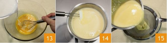 Puis versez le lait et la noix de coco chauds sur les jaunes d'œufs 13 en mélangeant et transférez à nouveau le mélange dans la casserole. Continuez la cuisson à feu doux, en mélangeant 14 jusqu'à ce que la crème nappe la cuillère. Ensuite, filtrez la crème à travers un tamis 15