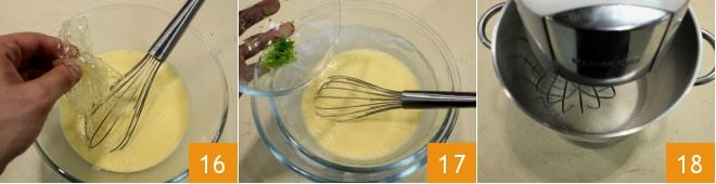 et recueillez-la dans un bol, ajoutez la gélatine bien essorée 16 et mélangez pour la faire fondre complètement dans la crème encore chaude. Une fois la gélatine complètement dissoute, placez le bol dans un plus grand contenant de glace (ce procédé sert à refroidir rapidement la crème tout en gardant sa consistance), ajoutez également le zeste râpé d'un citron vert 17 ; Montez la crème fraîche avec un robot culinaire doté de fouets 18 ou un batteur électrique ;
