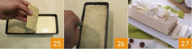 et terminez avec un rectangle de biscuit 25. Mettez à refroidir au congélateur pour une nuit. Décongelez ensuite le bavarois dans le réfrigérateur pendant quelques heures, puis passez un petit couteau le long des côtés du moule pour démouler plus facilement le bavarois 26, en le renversant sur un plat de service. Vous pouvez décorer votre bavarois à la noix de coco et au citron vert avec les tranches de citron vert séchées 27.
