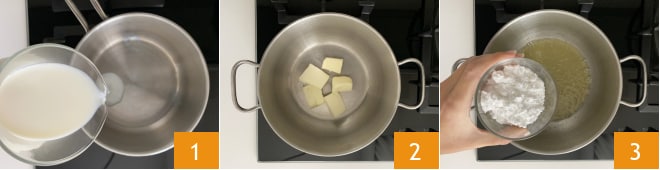 Pour préparer la béchamel sans gluten, commencez par chauffer le lait dans une casserole 1. Pendant ce temps, dans une autre casserole, faites fondre le beurre à feu doux 2. Lorsqu'il est fondu, éteignez le feu et versez la fécule de maïs d'un seul coup 3.
