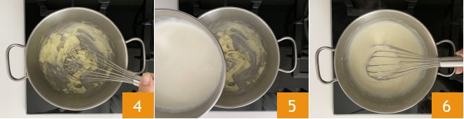 et mélangez rapidement avec un fouet à main 4. Rallumez le feu à feu doux et versez un peu de lait chaud, juste assez pour diluer le fond 5, puis versez tout le lait et mélangez rapidement pour éviter la formation de grumeaux 6.