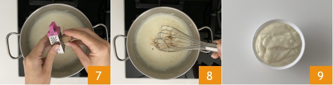 Laissez cuire la béchamel pendant 4-5 minutes, la sauce doit épaissir et atteindre l'ébullition. Une fois la cuisson terminée, assaisonnez avec du sel, du poivre noir et de la muscade 7. Un dernier mélange 8 et votre béchamel sans gluten est prête à être utilisée 9.
