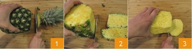 Pour réaliser les beignets à l'ananas, commencez par nettoyer l'ananas : retirez la calotte supérieure avec le plumeau 1, enlevez la peau 2 et coupez-le en tranches de 1 cm d'épaisseur 3,