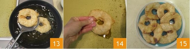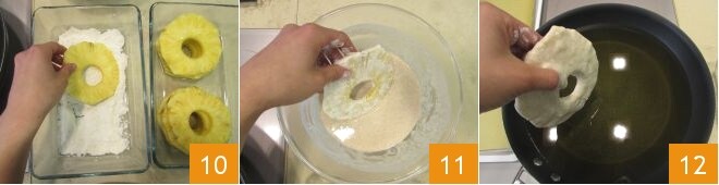 Remplissez une casserole d'huile de graines en abondance et portez-la à une température de 170° à contrôler à l'aide d'un thermomètre. Passez soigneusement les tranches d'ananas dans la farine 10, puis plongez-les dans la pâte 11, laissez la pâte en excès s'écouler et plongez-les délicatement dans l'huile chaude 12. Faites frire quelques morceaux à la fois pour éviter que la température de l'huile ne baisse.