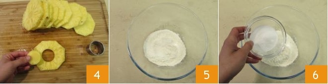puis utilisez un emporte-pièce d'environ 4 cm de diamètre pour retirer la partie centrale de chaque tranche 4 ; sinon, vous pouvez utiliser l'outil approprié. Passez à la préparation de la pâte : versez la farine dans un bol 5, ajoutez le sucre 6