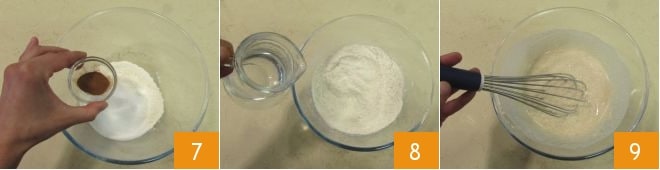 et la cannelle 7, puis versez l'eau 8 et mélangez avec un fouet jusqu'à obtenir un mélange lisse et homogène 9.