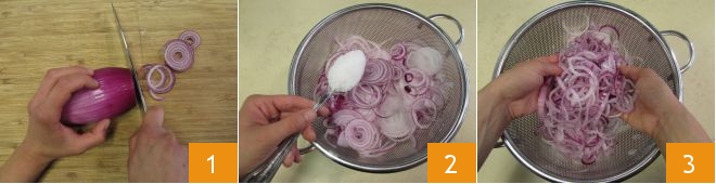 Épluchez les oignons et coupez-les en fines tranches 1. Transférez-les dans une passoire que vous aurez placée sur un bol et saupoudrez-les de 2 cuillères à soupe de sel 2. Mélangez bien avec les mains, en les massant pendant une dizaine de minutes 3, jusqu'à ce qu'ils soient ramollis et aient libéré du liquide.