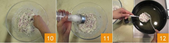 Travaillez le mélange avec les mains jusqu'à ce qu'il soit complètement homogène 10 et rectifiez l'assaisonnement en sel 11. Chauffez suffisamment d'huile jusqu'à atteindre une température de 170°, puis à l'aide de deux cuillères, plongez quelques beignets à la fois 12.