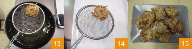 Faites cuire les beignets pendant environ 8 minutes, jusqu'à ce qu'ils soient bien dorés 13, puis égouttez-les au fur et à mesure sur un plateau recouvert de papier absorbant pour enlever l'excès d'huile 14 et servez vos beignets d'oignons de Tropea encore chauds 15.