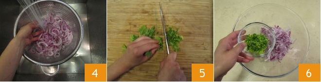 Puis rincez-les bien pour enlever l'excès de sel 4, égouttez-les et transférez-les dans un bol. Hachez le persil 5 et ajoutez-le aux oignons 6.