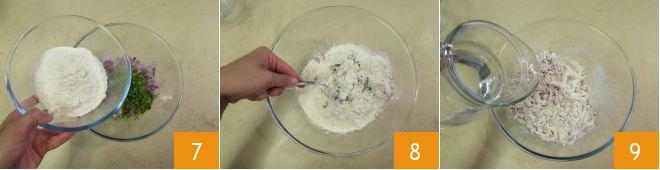 Ajoutez ensuite la farine 7, mélangez le tout 8 et ajoutez également l'eau 9.