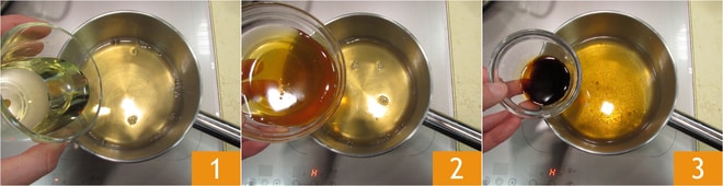 Pour préparer la friture de calamars au citron vert, versez dans une petite casserole le vinaigre de cidre, le vin 1, le miel 2, la sauce soja 3.