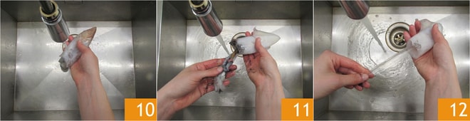 Maintenant, nettoyez les calamars : lavez-les sous l'eau courante 10, détachez la tête et éviscérez-les 11. Enlevez également l'os interne 12 et la peau.