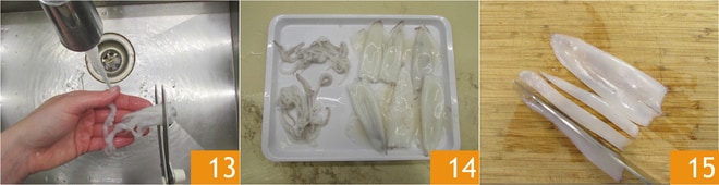 Coupez les tentacules 13 et détachez les yeux 13. Une fois que les calamars sont nettoyés 14, coupez le corps en lamelles 15.