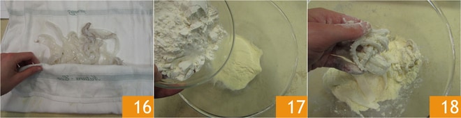 Laissez-les sécher sur un torchon 16. Dans un bol, mélangez la farine et la semoule 17. Farinez les calamars 18.