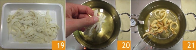Au fur et à mesure, déposez-les sur un plateau 19, en attendant chauffez l'huile pour la friture, immergez les calamars 20 et faites-les frire le temps nécessaire pour les dorer 21.