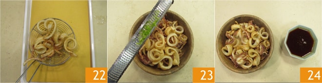 Égouttez sur du papier absorbant et salez 22, enfin aromatisez avec du zeste de citron vert râpé 23 et du poivre noir. Servez les calamars au citron vert avec la sauce aigre-douce 24.