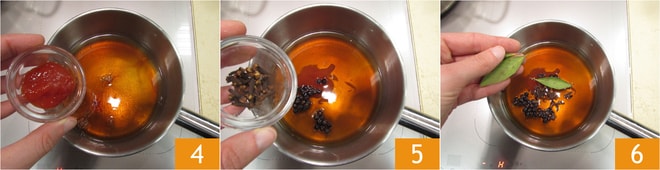 Ajoutez également le concentré de tomate 4, les baies de genièvre, les clous de girofle 5 et les feuilles de laurier 6.