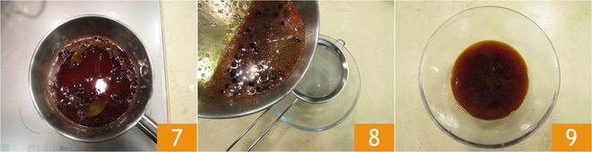 Portez tous les ingrédients sur le feu 7 et laissez réduire d'un quart le produit pendant environ une heure. Filtrez la sauce obtenue à travers une passoire 8 et réservez 9.